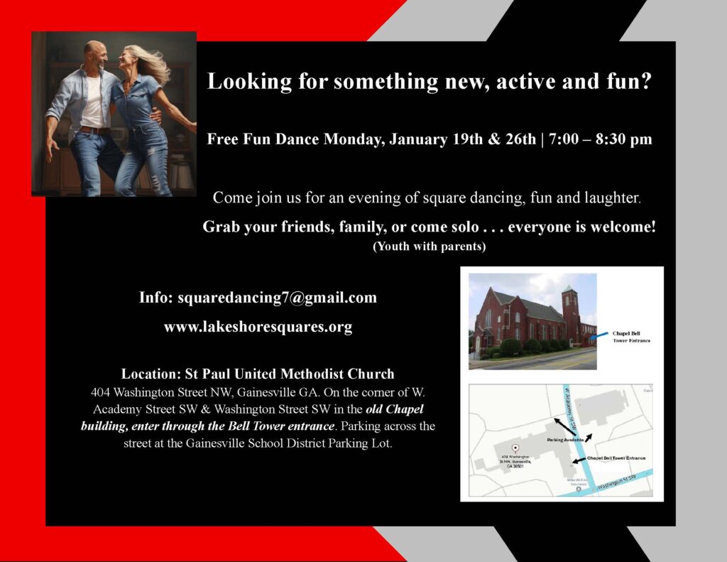 Effective March 4, 2025: New Dance Location, St Paul United Methodist Church, 404 Washington Street NW, Gainesville GA. Entrance to dance hall: Chapel Building, Bell tower entrance on the corner of W. Academy Street SW and Washington Street SW.